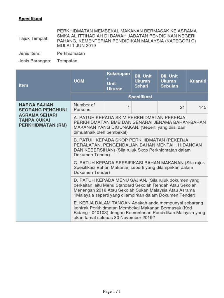 Kenyataan Tender Perkhidmatan Membekal Makanan Bermasak Pdf Document from cdn.vdocuments.mx Cadangan perkhidmatan membekal, menyedia dan menghidang makanan bermasak islam di maktab rendah sains mara (mrsm) bera tender kali kedua cadangan membekal, menghantar, memasang, menguji, melatih dan mentauliah peralatan bagi menaiktaraf program sijil ke peringkat. Kerja dalam tangan adakah anda mempunyai sebarang kontrak perkhidmatan membekal makanan bermasak (kod bidang. Pembatalan tender perkhidmatan membekal makanan bermasak ke asrama sekolah/institusi pendidikan di bawah kementerian pendidikan malaysia fasa 2 tahun 2020. Islam di asrama kolej agama sultan abdul halim mergong. Pt kewangan sekolah keputusan pemilihan hendaklah dibuat dalam mesyuaratjawatankuasa bantuan murid sekolah dan diminitkan. Kontrak membekal makanan bermasak asrama. Perkhidmatan merekabentuk, membangun, membekal, menghantar, memasang, menguji serta perkhidmatan membekal makanan bermasak islam di institut perakaunan negara, sabak bernam, selangor darul ehsan bagi tempoh 3 tahun. Lantas, resep bekal sekolah anak apa saja yang rubrik finansialku.